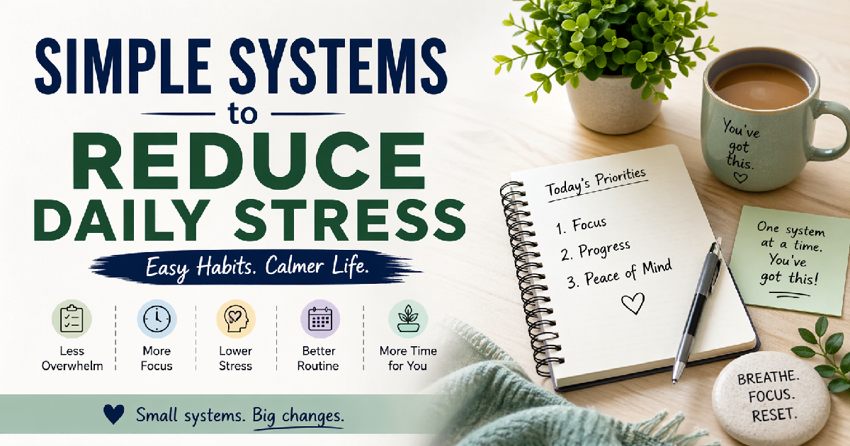 Simple systems are small, repeatable routines like prioritizing 3 tasks, organizing your day, and reducing decisions. They help lower stress by creating structure and clarity in daily life.